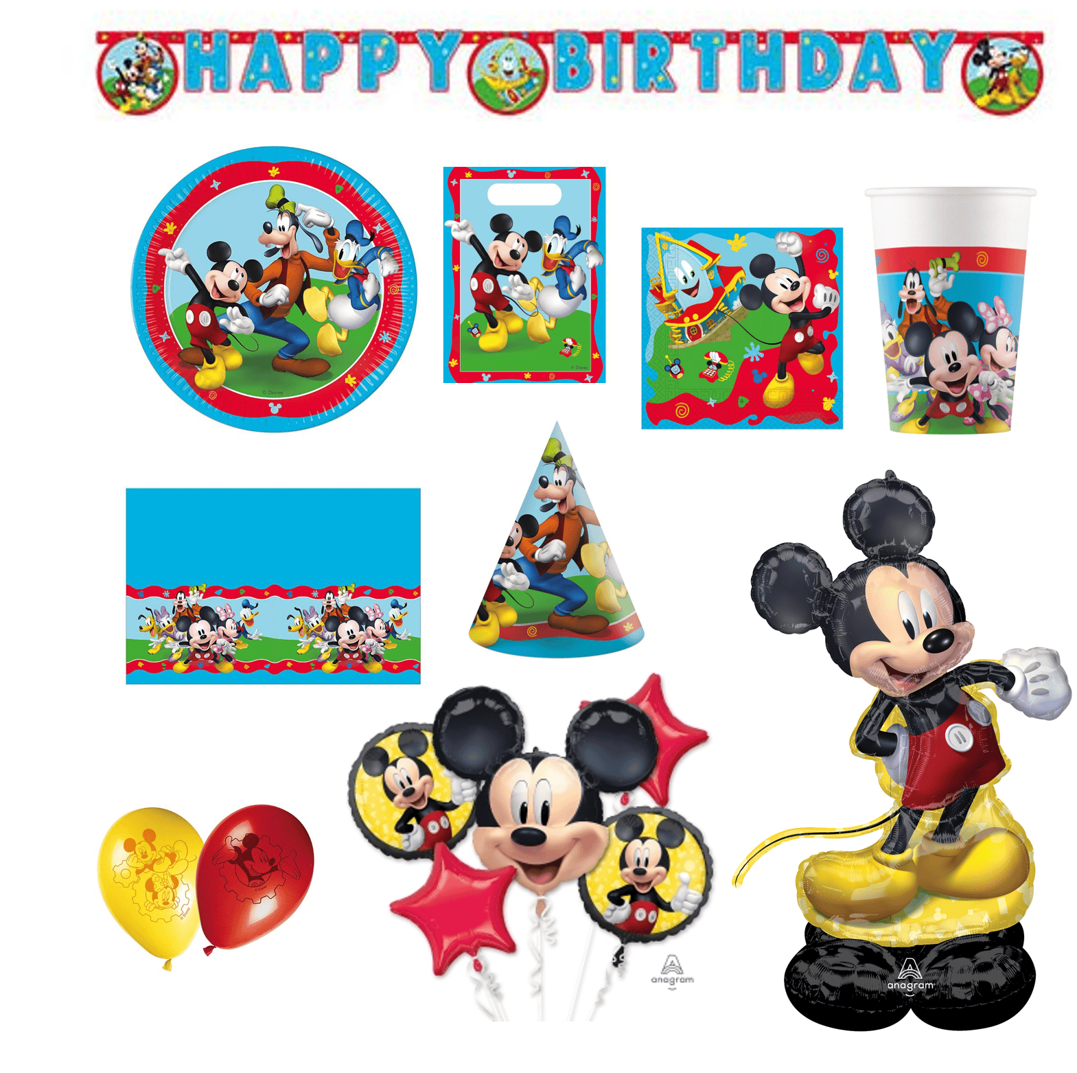 1x Mickey Mouse Airloonz, 1x Mickey Mouse Plastic Tablecover, 20x Mickey Mouse Paper Napkins, 1x Mickey Mouse Happy Birthday Banner, 8x Mickey Mouse Paper Party Bags, 12x Mickey Mouse Party Hats, 8x Mickey Mouse Paper Plates, 8x Mickey Mouse Paper Cups, 8x Mickey Mouse Latex Balloons, 1x Mickey Mouse Foil Balloon Set